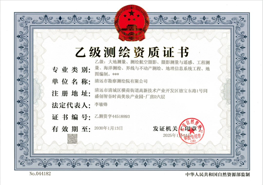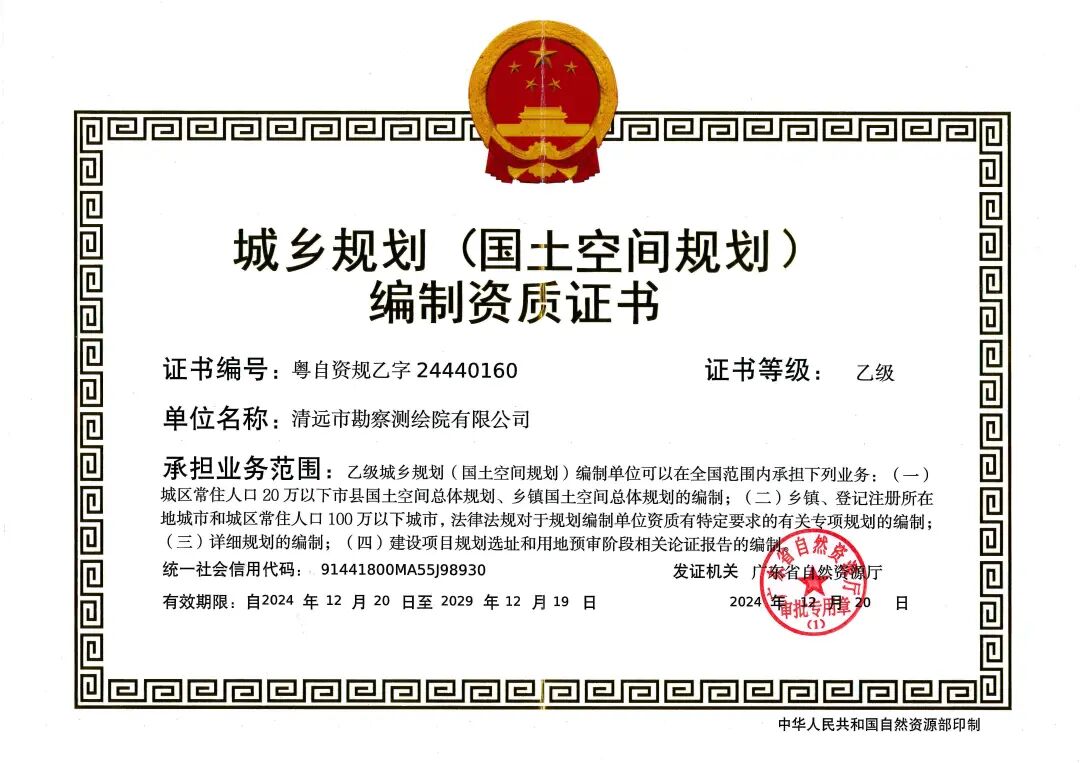勘测院公司具有广东省自然资源厅颁发的国家测绘资质乙级证书、城乡规划(国土空间规划)编制乙级资质证书、广东省市场监督管理局颁发的检验检测资质证书(CMA)和民用无人驾驶航空器运营合格证,软硬件配套齐全,业务覆盖测绘、规划、检测及技术服务全链条。