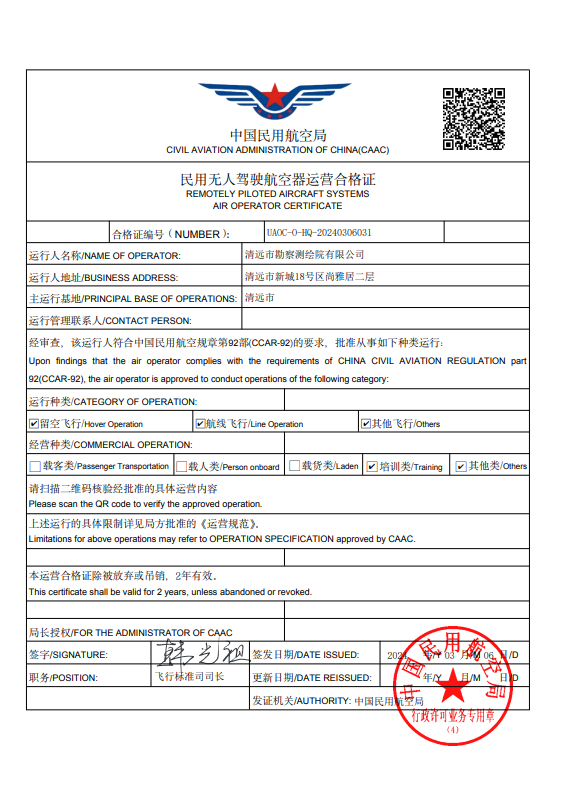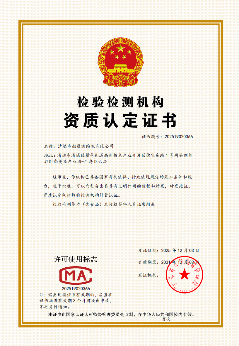 勘测院公司具有广东省自然资源厅颁发的国家测绘资质乙级证书、城乡规划(国土空间规划)编制乙级资质证书、广东省市场监督管理局颁发的检验检测资质证书(CMA)和民用无人驾驶航空器运营合格证,软硬件配套齐全,业务覆盖测绘、规划、检测及技术服务全链条。