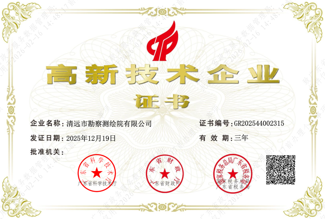 近日,城科集团下属清远市勘察测绘院有限公司(下称“勘测院公司”)顺利通过国家高新技术企业认定,成功跻身国家级高新技术企业行列。此次认定不仅是对勘测院公司科技创新实力、技术研发水平和成果转化能力的权威肯定,更是勘测院公司深耕测绘地理信息领域、践行新发展理念的重要成果,同时也为城科集团建设工程“专业化+一体化”服务链条注入强劲科技动能。