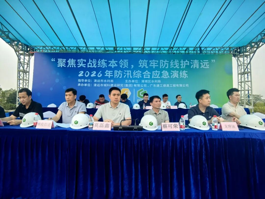 为深入贯彻落实防汛减灾工作部署,全面提升防汛抢险实战能力,2026年清城区大燕河西瓜岭堤段防汛综合应急演练于近日顺利举行。本次演练由清远市水利局指导、清城区水利局主办,德晟集团下属清远市城科建设研究(集团)有限公司(以下简称“城科集团”)与广东建工德晟工程有限公司共同承办。